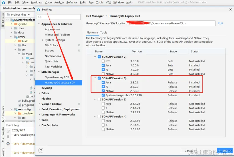 第一步,DevEco Studio下载安装,安装完成后要配置Windows环境变量(参考:docs.openharmony.cn/pages/v3.1/… Studio设置下的SDK Manager,安装SDK(API6)红框中的都需要下载。值得注意的是第一步安装Studio时会下载OpenHarmony SDK,第二步的SDK不一样,不能在同一个路径下,否则会被替换掉原有的。