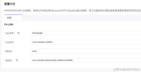 第二步,按照提示填写即可,在标签配置页面,填写在应用调测助手申请的Product ID 型号00。在FA配置页面,一定要查看第2.3节第四步自己写的包名,模块名就是entry,添加设备就是com.example.distschedule.AddDeviceAbility: