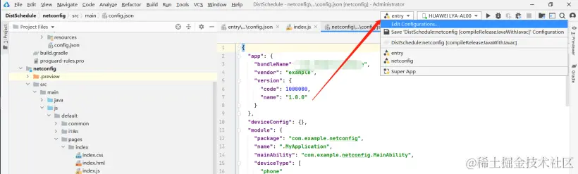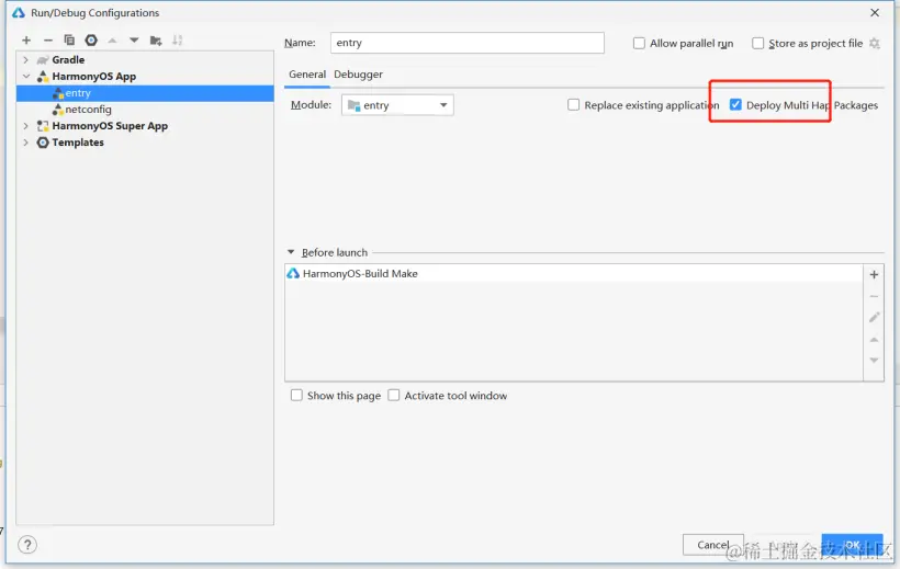 点开entry,进入debug configuration,在entry下勾选deploy multi haps packages,确认后退出。因为数字管家包含entry、netconfig两个module,要同时安装。