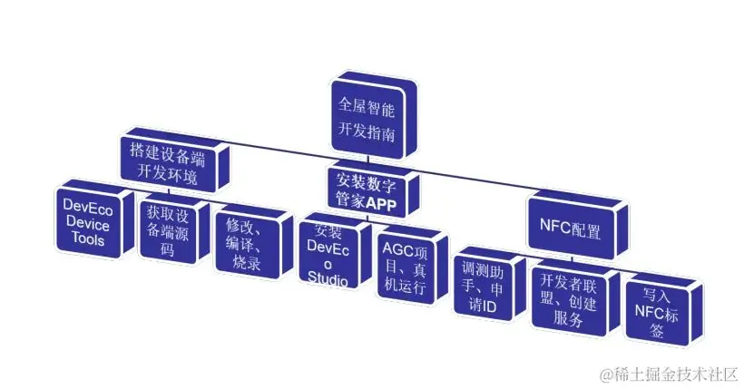 项目主要包含:①搭建设备端开发环境、②数字管家安装、③配置NFC标签、④实操验证,共四个部分。开发过程中各关键环节如下图,整体思路是准备软硬件环境,编写业务代码,烧录测试,若开发时遇到问题可参考该图进行排查。