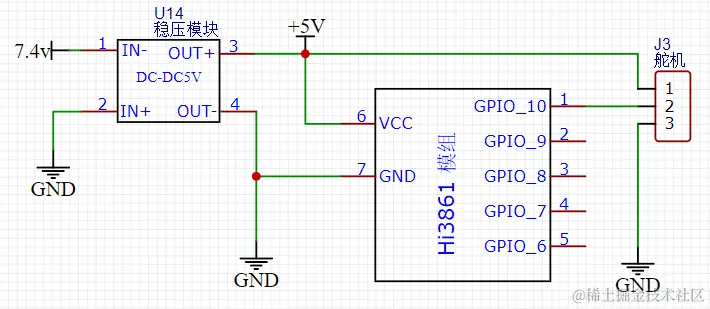 电路简单,将7.4v电源经过降压稳压后分别给模组、舵机供电。