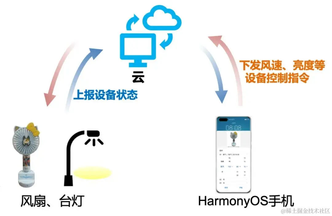 智能台灯与风扇(包括门锁)、数字管家应用、云平台三部分数据流如下图所示。数字管家应用下发风速、亮度调节等设备控制指令到云平台,云平台发送到指定设备,同时风扇、台灯等设备上报当前状态到云平台,云平台再发送至数字管家应用,实现用户可视化操作,实时控制智能设备。