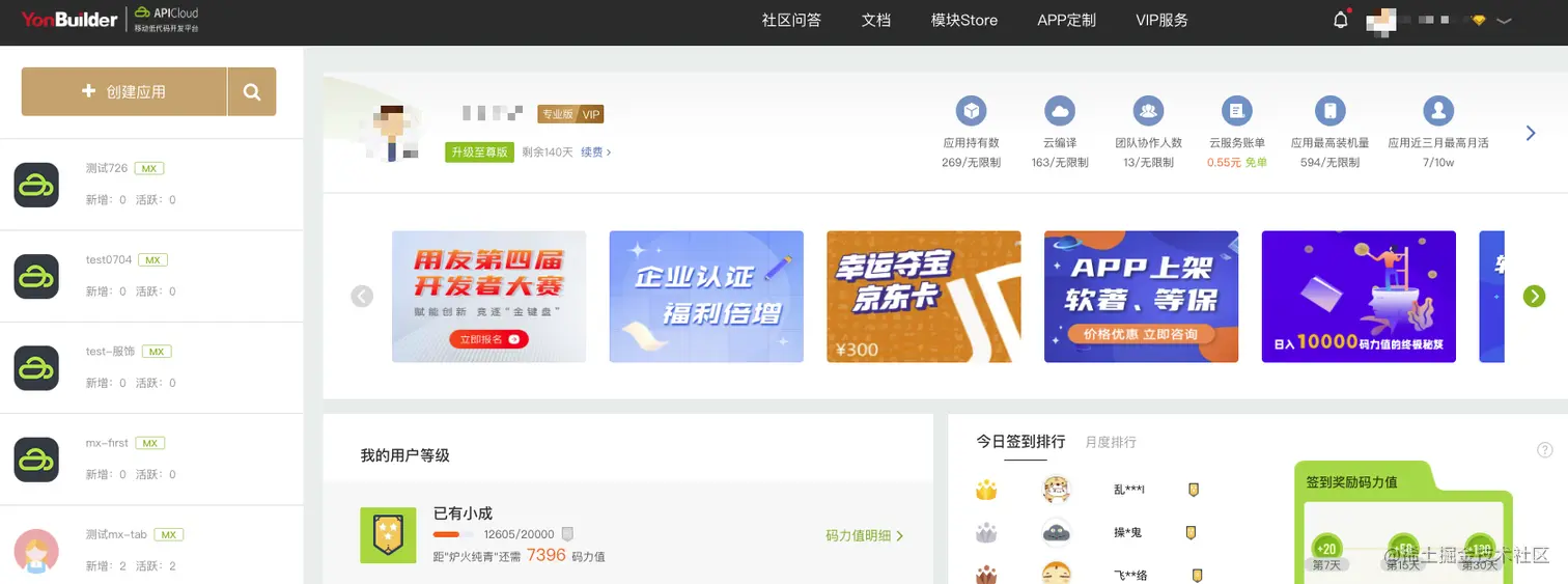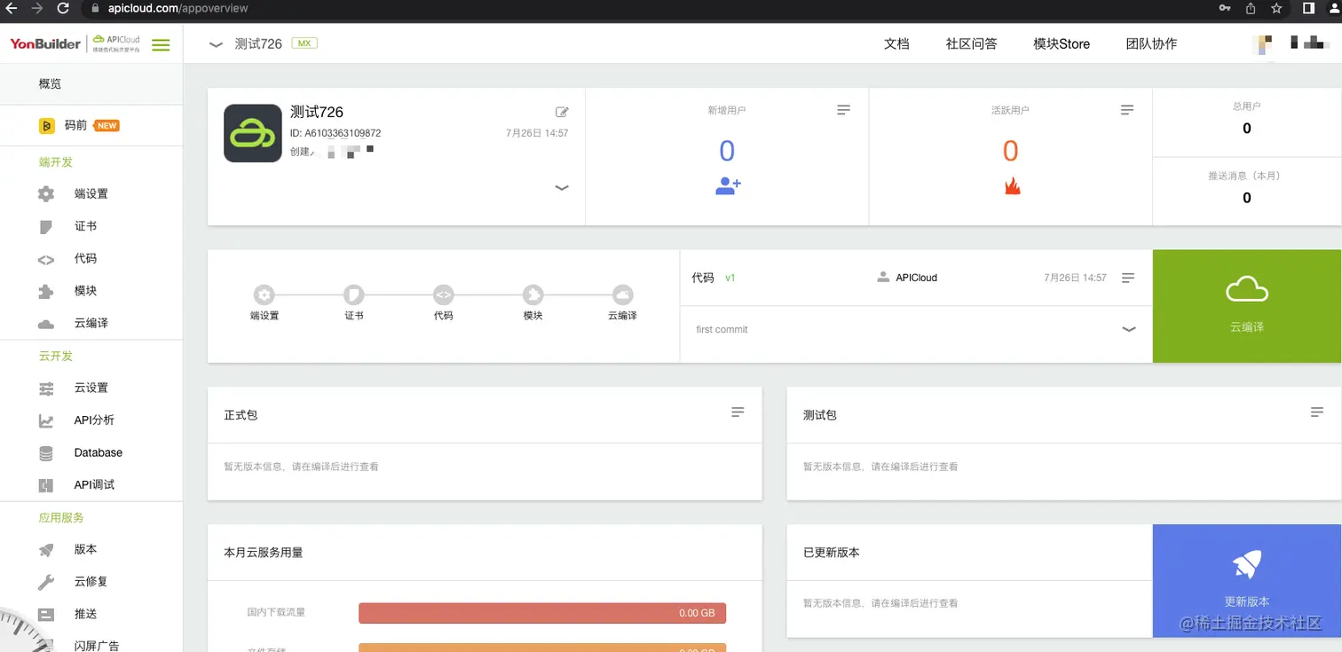 开发控制台:指 APICloud 官网开发控制台,有很多功能,如创建应用,上传应用图标,上传应用启动页,上传应用证书,云编译(生成安装包),版本更新,云修复等。