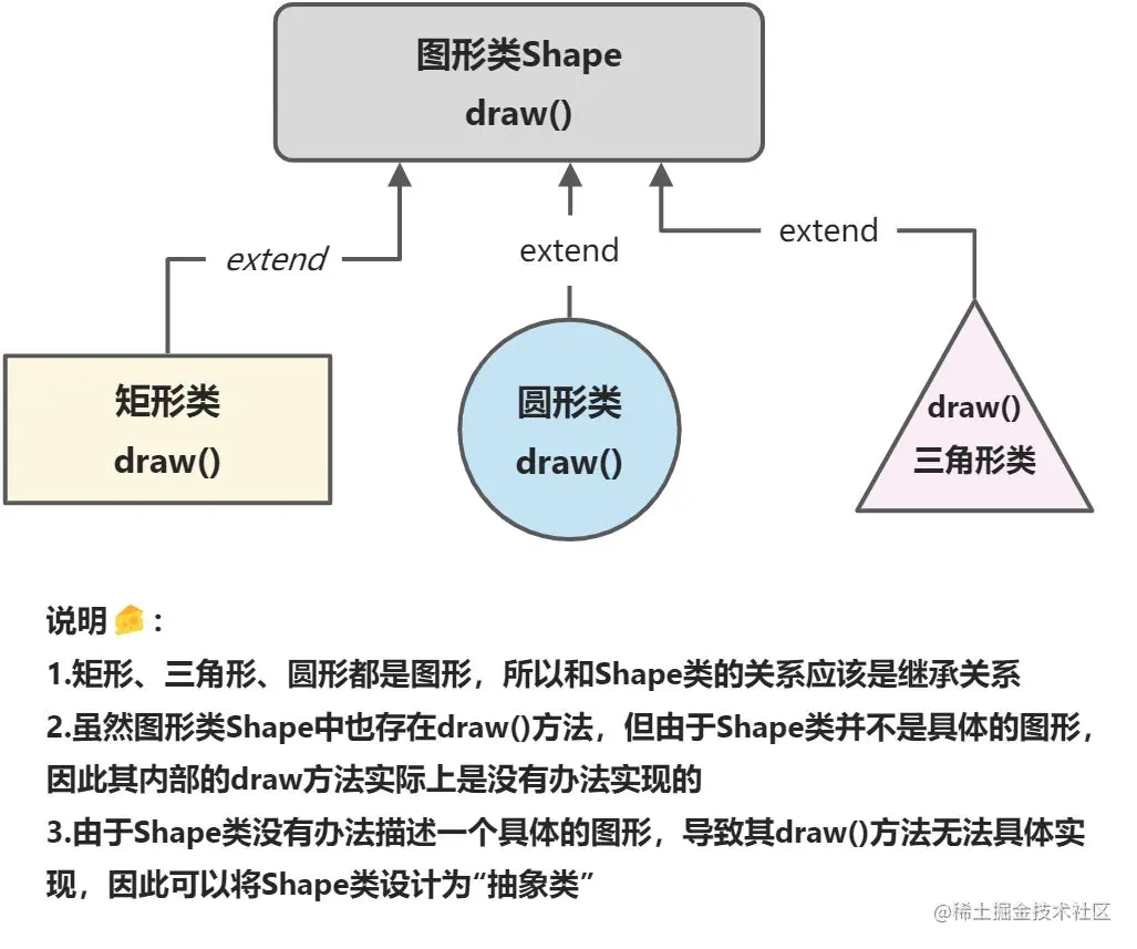 在打印图形的例子中,我们发现了,父类Shape中的draw方法好像并没有什么实际的工作,主要的绘制图形都是由Shape的各种子类(比如矩形类,三角形类,圆类)中的draw方法来完成的。