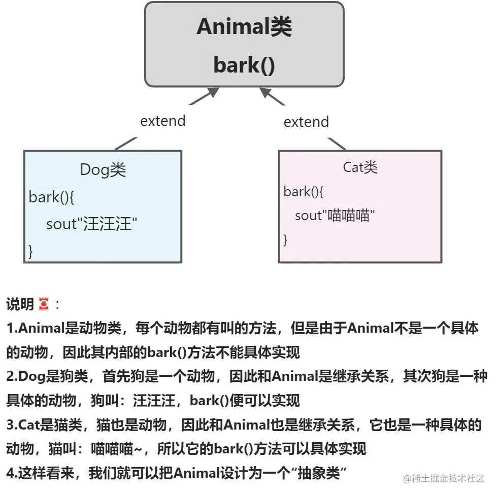 - 🍜 抽象类必须被继承,并且继承之后子类要重写父类中的抽象方法,除非子类也是抽象类,否则就必须要使用abstract修饰