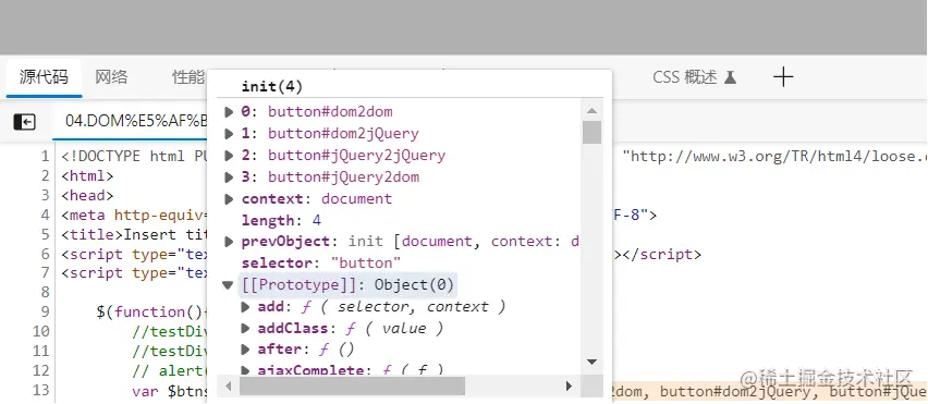 对上面这段代码我们通过调试得到实际上**$(btns)对象 即jQuery对象 = dom对象的数组 + jQuery提供的一系列功能函数**