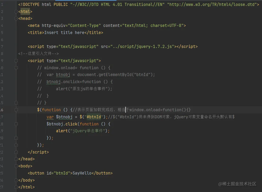 这里我们通过一个小案例先演示一下(分别通过原生js与jQuery实现一个按钮的单击事件)