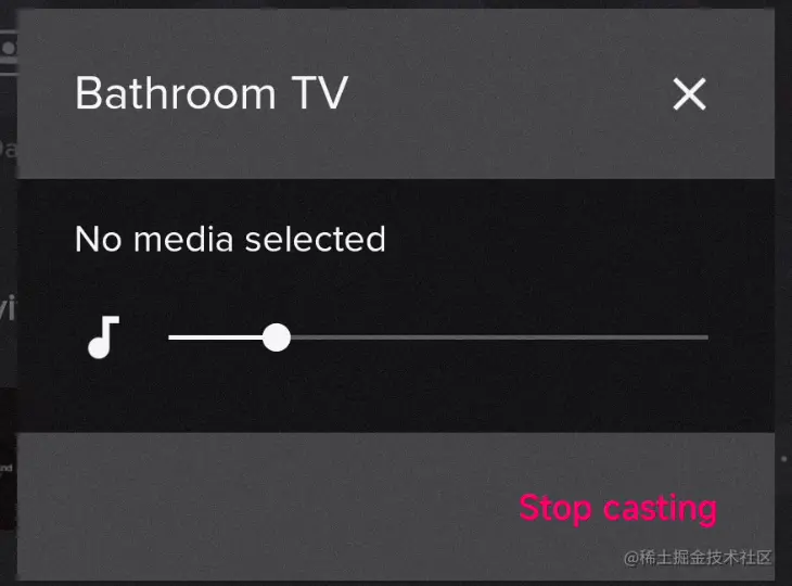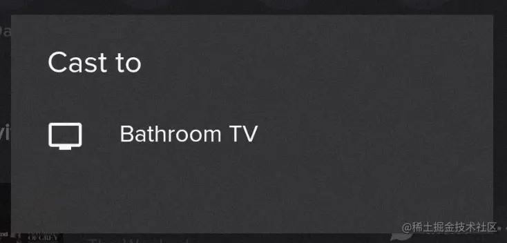 我们的产品是一个海外音乐播放器,之前接入过 Chromecast,可以将音视频投屏到连接了 chromecast 设备的电视或者显示器上。之前我们接入的交互方式是使用官方文档里的 MediaRouteButton,投屏入口仅仅只是一个按钮,我们点击这个按钮之后的交互,都交给了 SDK。在按钮点击之后弹出的设备选择弹窗也是集成在 SDK 内部的,我们并没有自定义弹窗样式。