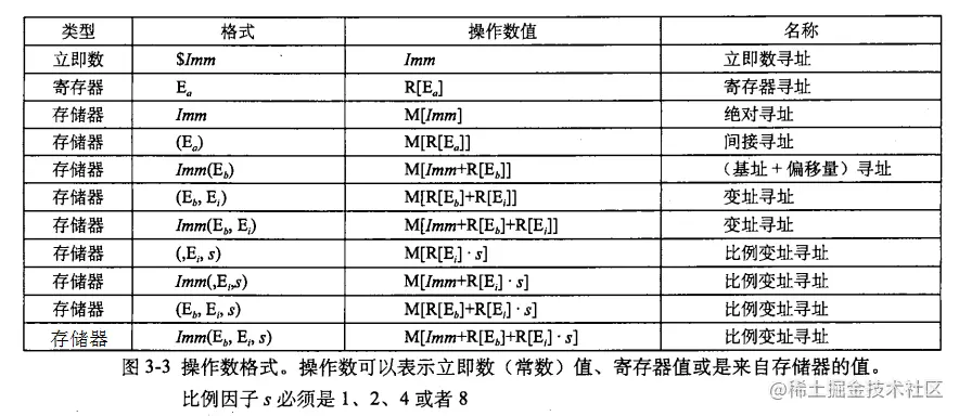 从上图我们知道,第一行是立即数,第二行则是寄存器,剩下的全部是存储器。其中最后一行存储器语法 Imm(Eb,Ei,s),表示的是最常用的形式,分为四个部分,