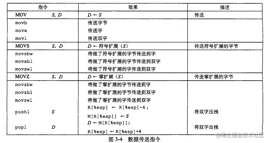 MOV 类由三条指令组成:movb,movw和 movl。指令格式为 [movx S D],表示将源操作数S中的数据复制到目的操作数D中。三种指令的区别是它们分别是在大小为 1,2和4个字节的数据上进行操作。