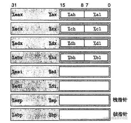 这里我们要讲的就是第三个整数寄存器,在 32 位 CPU 中包含一组 8 个存储 32 位值的寄存器。这些寄存器用来存储整数数据或指针。下图是 IA32 的整数寄存器: