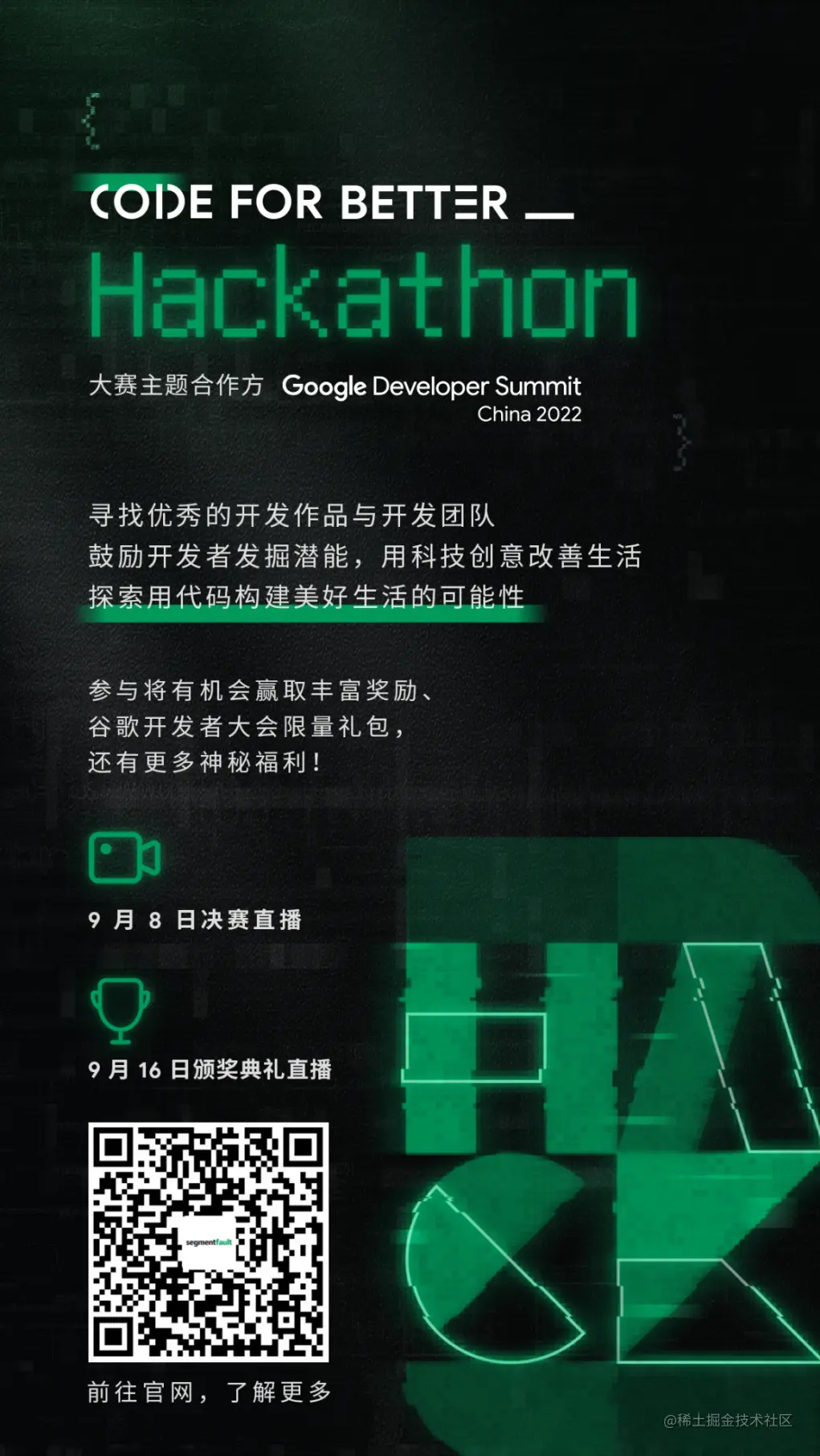 不同于往年,作为今年大赛的主题合作伙伴,2022 Google 开发者大会为大赛注入了新的活力。提到这次合作背后的故事,SegmentFault 思否 CEO 高阳向我们介绍道: “ 2022 Google 开发者大会举办 ,CODE FOR BETTER_ 的主题与我们一直践行的理念不谋而合,也是众多开发者的心之所向。 中国开发者数量众多,并且在全球科技舞台上举足轻重。他们的技术能力和灵感创造,能为世界带来更多有有价值的、优秀的应用和产品,为推动科技事业发展带来无限活力。基于此我们决定举办一场 Hackathon 大赛,展现中国开发者的团结力量和创新力量。”
