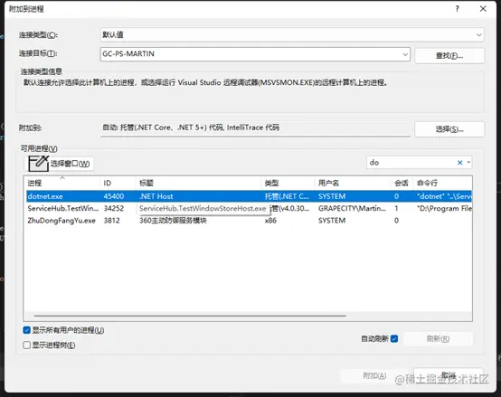 - 进程调试 ctrl+alt+p,选择 显示用户所有进程,选中dotnet.exe 打中断点。点击附加。程序中选择断点。