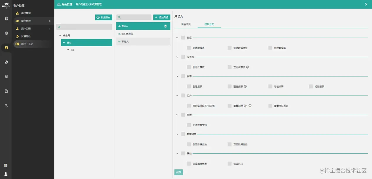 传递的组织内容为:"/A/B" 顶级组织信息为 "/" 角色配置:给对应的角色设置权限