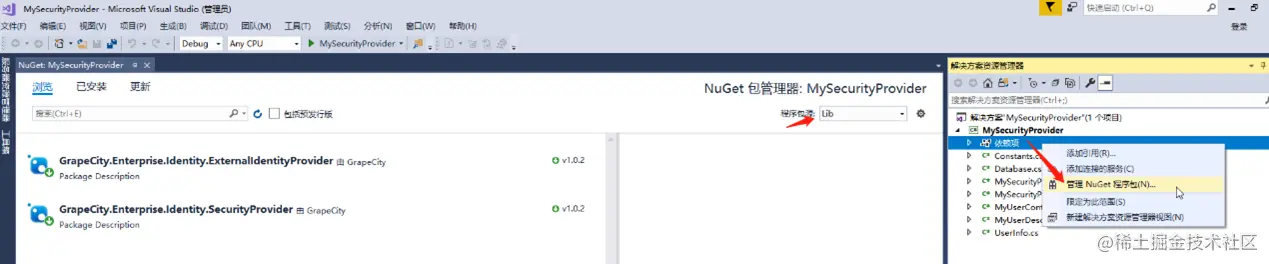 (2) 添加程序包依赖 自定义安全提供程序所实现的接口是由几个程序包定义的,为此需要添加对这几个程序包的依赖。方法如下: 首先将下面这两个文件下载保存到本地硬盘,比如C:\Temp\pkg 文件夹下: grapecity.enterprise.identity.externalidentityprovider.1.0.2.nupkg