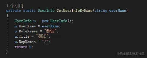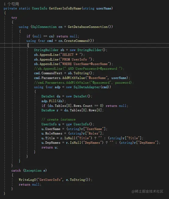 - MySecurityProvider.cs 文件中的 GetUserContextAsync 方法,根据方法追踪,最终所调用的方法为 Database.cs中的GetUserInfoByName 方法,所以过程忽略,直接改造此方法即可。 注意:这里所返回的用户信息,则直接会在wyn中登录后所用到,所以这里注意返回结果信息。 (图例3)【根据用户名获取用户相关信息】