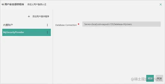 此示例代码中的解决方案(.sln)可在Visual Studio 2017中直接打开。示例代码文件夹\bin\debug中也包含Build产物DLL,可直接配置为Wyn的安全提供程序。示例的用户信息是保存在SQL Server数据库中的,请将本文件包中的db\MyUsers.bak文件恢复为SQL Server数据库。