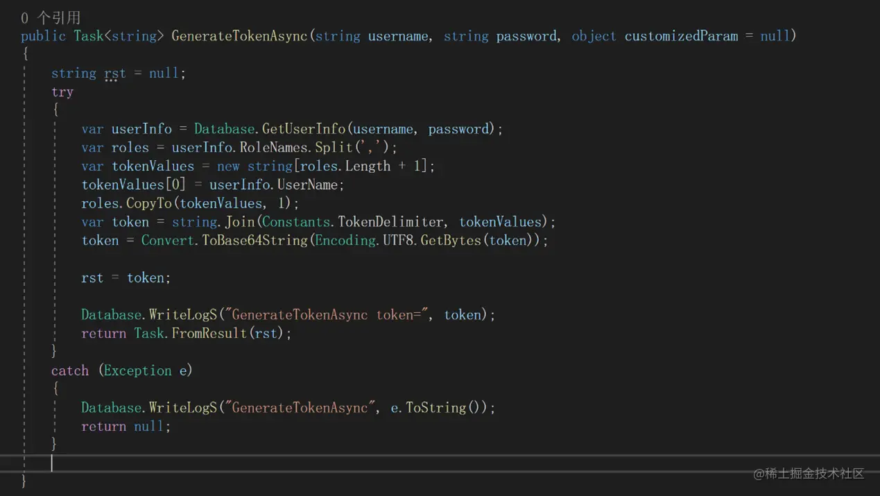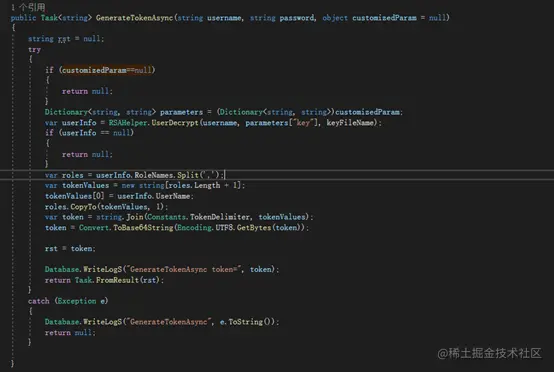 - MySecurityProvider.cs 文件中的 GenerateTokenAsync 方法,此方法用于第一次登录中,验证登录信息的方法。所以这一步需要完成的功能就是验证用户名密码,案例中所给的验证方式为从数据库中直接获取用户信息后判断登录。这里可以实现自定义的验证方式。只需要对此方法中的 Database.GetUserInfo 这个被调用的方法进行改造即可。 【链接数据库进行验证】