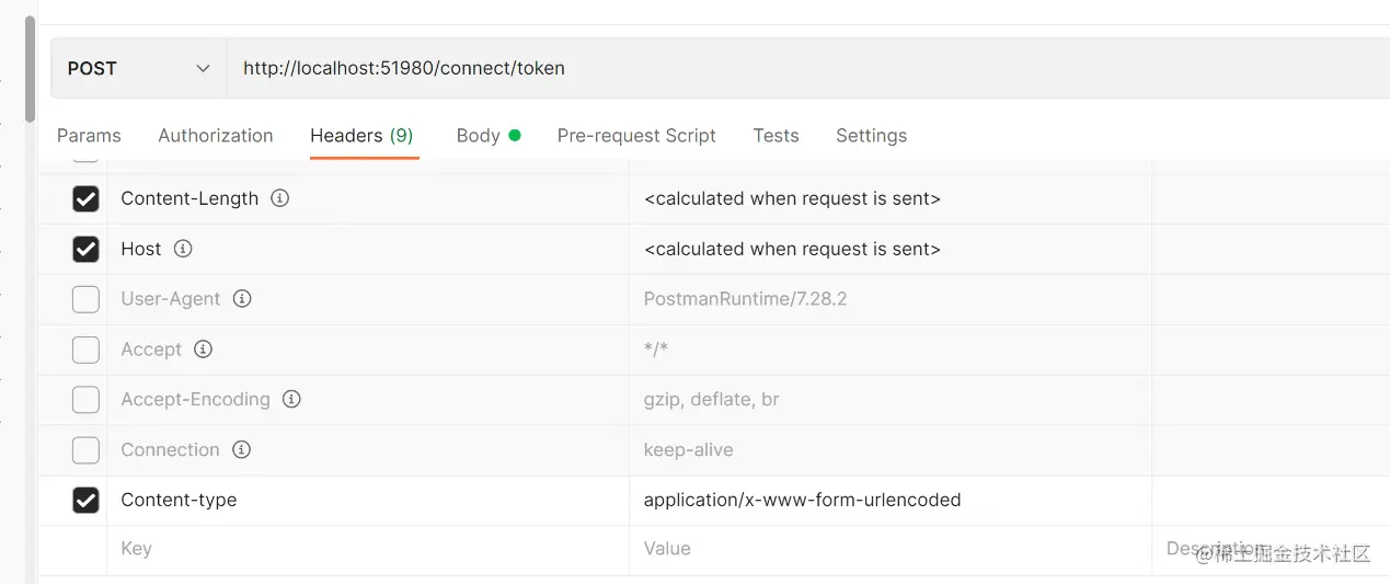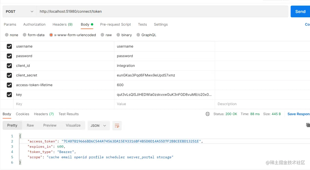通过postman调用生成token ,生成对应的安全自定义程序。 请求参数中:client_id,client_secret 为 Client Management 中所生成内容. 具内容参考 登录API客户端管理 默认信息有: client_id:integration client_secret:eunGKas3Pqd6FMwx9eUpdS7xmz 后期可以自行设置修改。 请求截图: