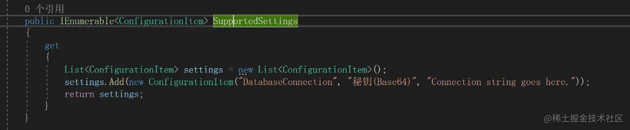 public IEnumerable<ConfigurationItem> SupportedSettings // 本安全提供程序支持的用户配置项。