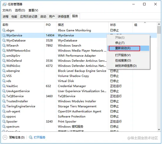 (5) 重启服务 为使自定义安全提供程序的设置生效,需要进入任务管理器重启WynService服务。