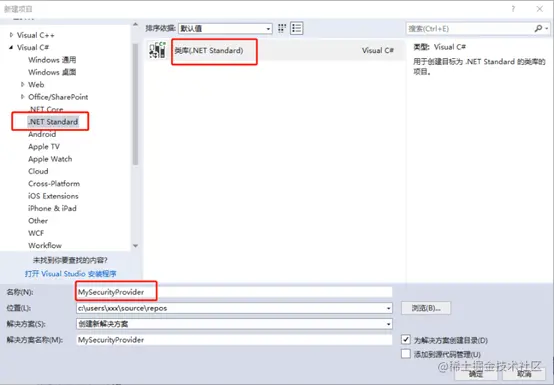 使用Microsoft Visual Studio 2017(以下简称VS2017),创建一个新的项目,类型选为 Visual C# - .NET Standard - 类库(.NET Standard),输入项目名称,如:MySecurityProvider: