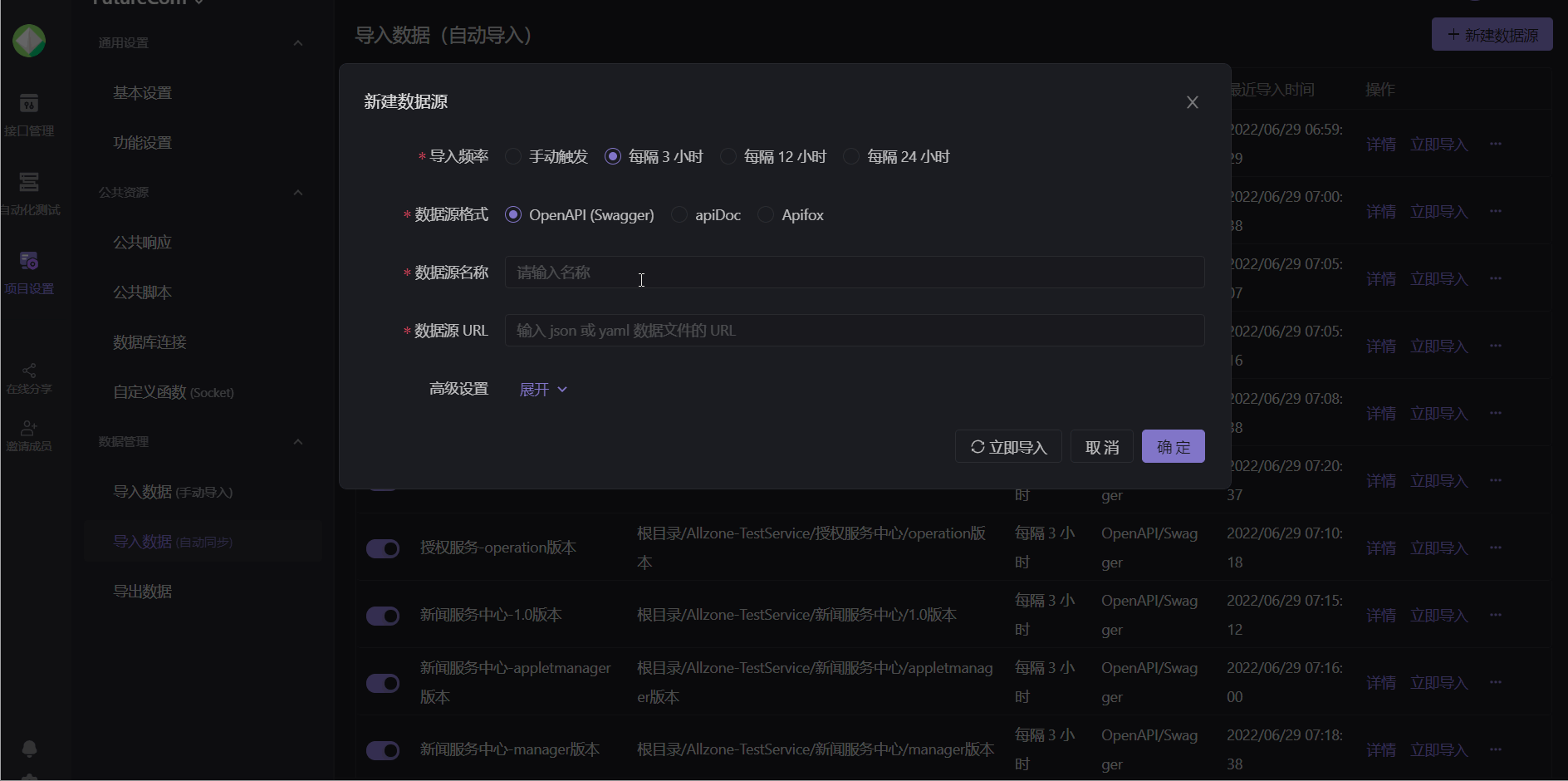 在项目概览的位置,有一个自动导入功能,可以看到选择导入的频率,亲测每隔3小时之后就会更新接口。