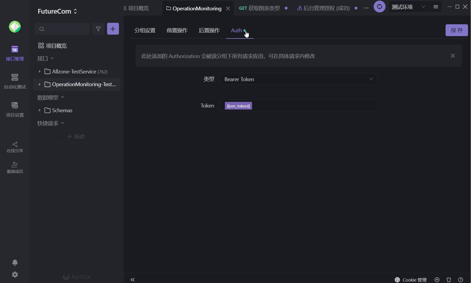然后使用,在接口的总目录里,点击【Auth】,选择【Bearar Token】,Token的值选择刚刚配置的变量名【om_token】。这里可能不同的接口有不同的token类型,只需选择对应的接口文件夹里配置对应的token变量即可。
