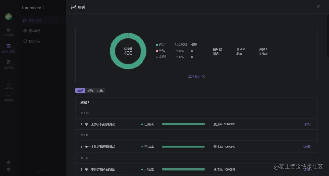配置之后,可以查看对应的测试报告,成功和失败的数据,以及接口调用的时间。咱们是不是可以开发一个功能之后,配置一些压力测试数据,让他自己跑我们就可以摸鱼刷水去了?