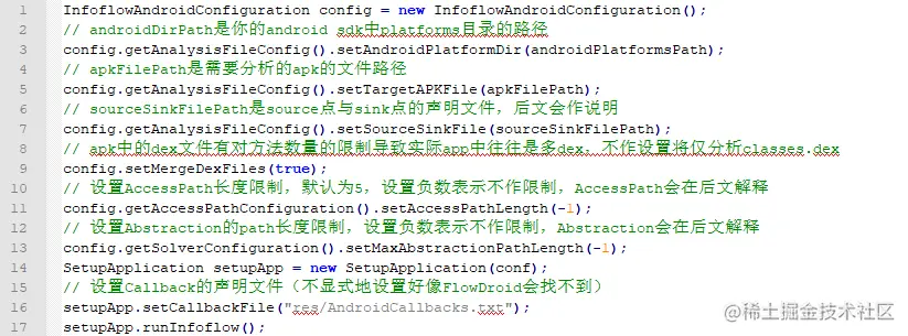 整个FlowDroid最顶层的类便是soot.jimple.infoflow.android.SetupApplication,大部分的设置与运行都可以通过操作这个类的实例进行。SetupApplication既可以在调用runInfoflow()时传入配置参数,也可以在初始化SetupApplication时或初始化后传入配置参数。SetupApplication的初始化函数以及runInfoflow函数有多种不同参数类型的实现,可以查阅源码后根据情况选择,这里仅提供我自己使用的一种方式: