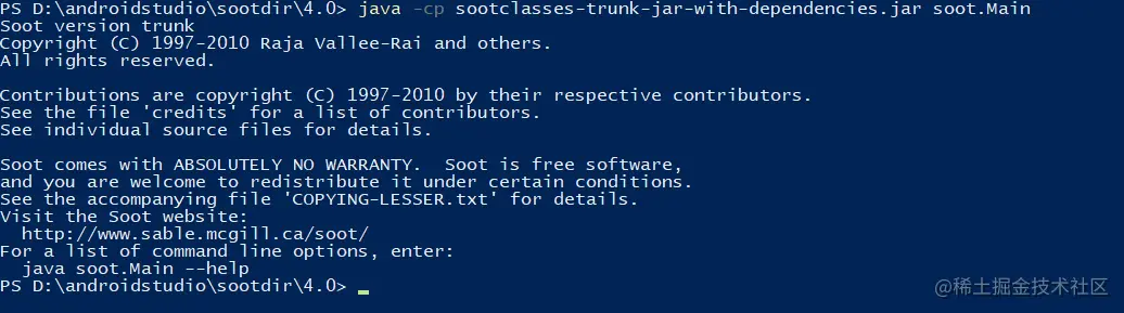 可以GIT下载最新的soot jar包,我下载的是4.1.0版本中的sootclasses-trunk-jar-with-dependencies.jar 包,这个包应该自带了soot所需要的所有依赖。下载完成后使用powershell进入jar文件所在的文件夹,可以输入以下命令: