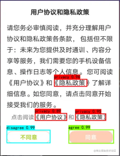 如上图所示,在Sechunter的UI自动化中,我们需要获取应用的隐私声明文件链接,以及相应的“同意”、“不同意”的位置。在uiautomator无法获得UI布局的情况下,可以进行目标识别,通过图像获得可点击位置,从而推进UI自动化测试的继续执行。