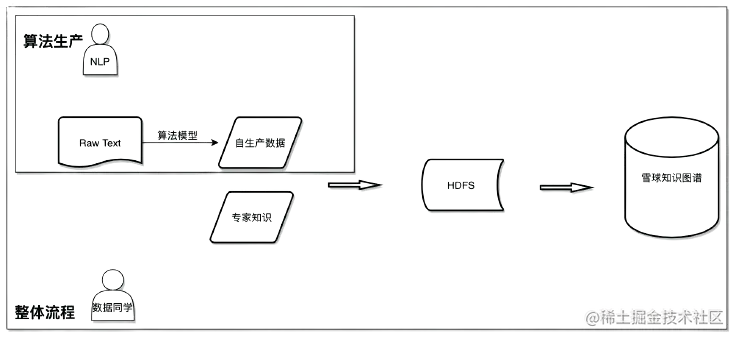 整体的数据生产流程由数据同学进行负责,数据同学利用相关组件对专家知识、自生产知识进行汇总与加工,并建立基础的hive表,同时负责整体数据导入知识图谱。