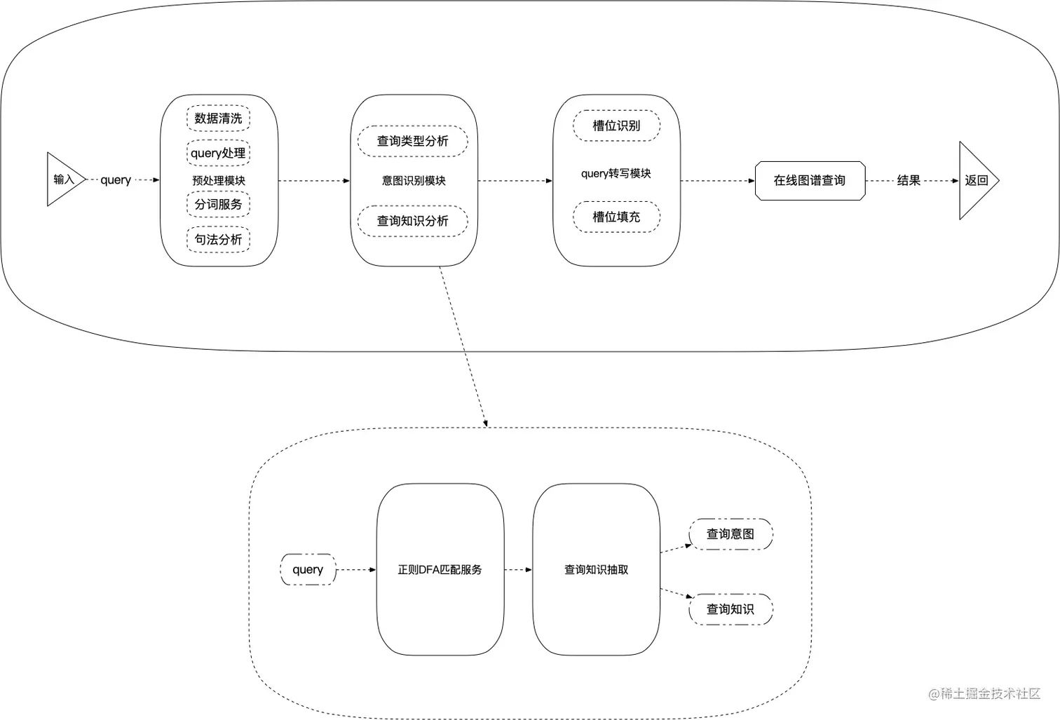 雪球知识图谱搜索系统可以分析用户的搜索意图,并将查询query转换为对应的查询语句,执行知识图谱查询并返回结构化的查询结果。该服务的构建主要包含两部分:搜索意图识别模块(意图理解引擎)、query转写模块。意图识别模块负责识别搜索的具体意图,query转写模块可以将对应的搜索query转化成知识图谱查询语句进行查询,整体流程如下: