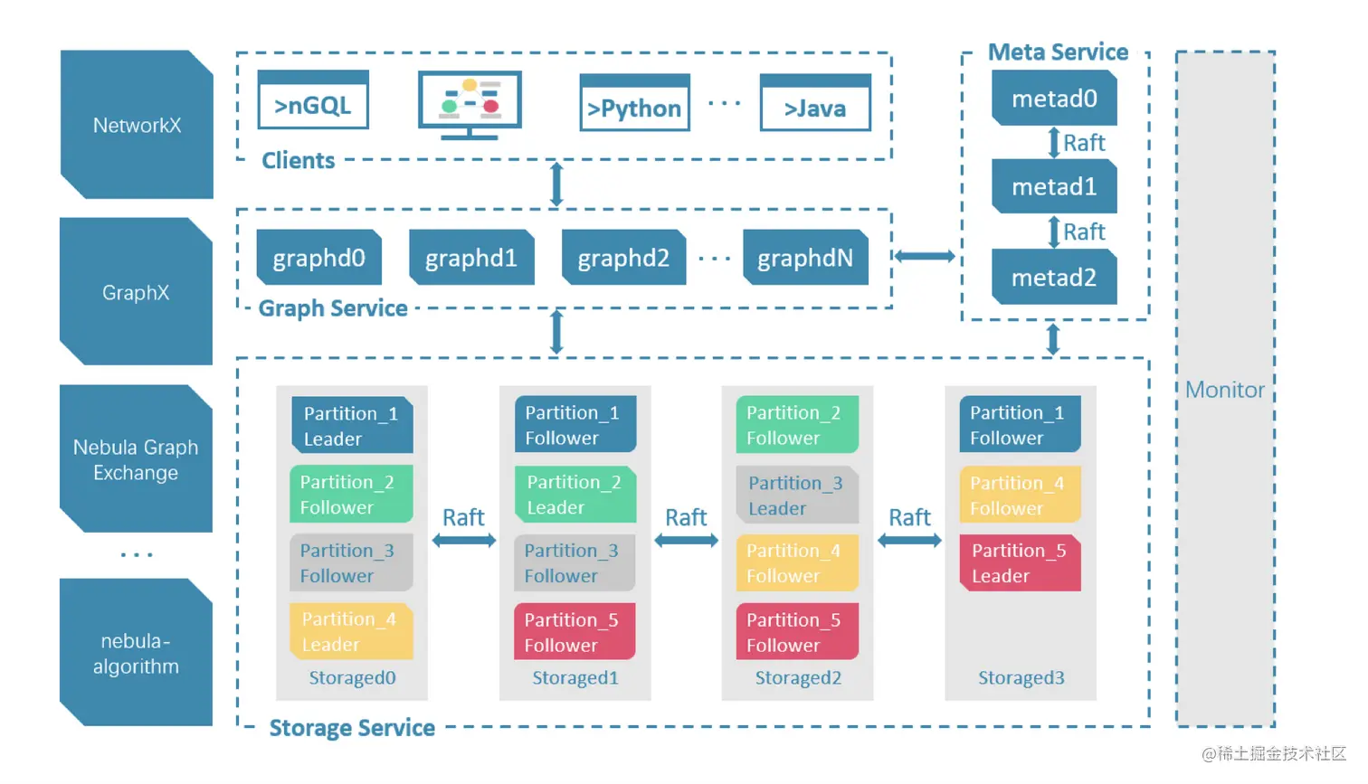 为了保障知识图谱的存储并支持大规模线上的服务,我们在构建图谱的伊始就对知识图谱的存储方式与服务方式进行了思考。出于对可维护性、存储稳定性、图谱查询服务高可用等多方面的考虑,着重调研了市面开源的多款图数据库:Neo4j、Nebula、Jenus等。通过选型和对比,最终选用图数据库Nebula存储知识图谱。Nebula Graph 是一款开源的、分布式的、易扩展的原生图数据库,能够承载包含数千亿个点和数万亿条边的超大规模数据集,并且提供毫秒级查询。