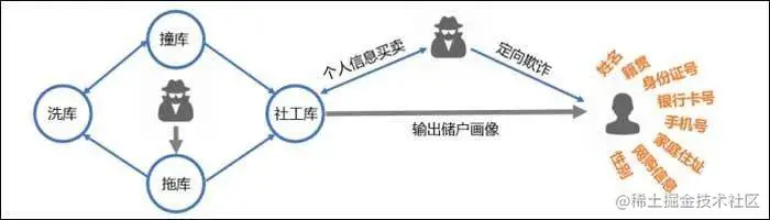 **第一步,获取目标储户信息。**收集目标储户信息,是黑灰产业链的上游来完成,主要包括拖库、洗库、撞库、打造社工库。黑灰产将窃取的大量数据库资料进行分类梳理,然后,基于社工库对储户进行全方位的画像,以便于对对特定人群进行定向诈骗活动。