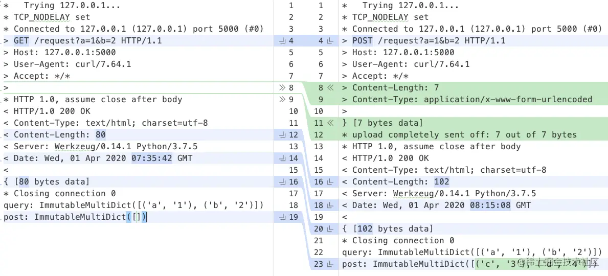 GET、POST 请求对比 注意:>的右边为请求内容,<右边为响应内容