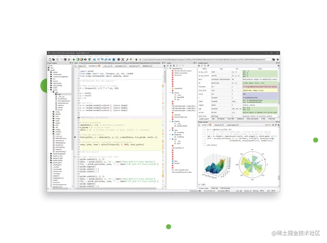 Spyder 是为数据科学而开发的。它是开源工具,能够与大量平台兼容,因而成为 IDE 新手用户的更好选择。为实现完美开发,它合并了多个关键库,如 NumPy、Matplotlib 和 SciPy。