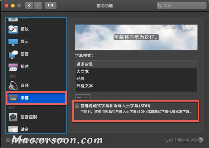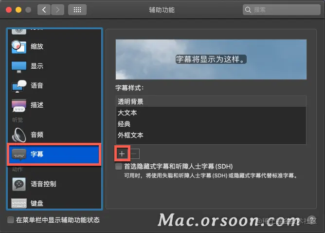 4.您将能够为字幕选择四种可用样式中的任何一种。选择您喜欢的一种后,启用首选隐藏式字幕和 SDH框。这将在 macOS 中为您的所有应用启用隐藏式字幕。