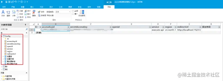 - 构建一个config表,存储接口的必要参数和结果,方便后续调用 accessKeyId,secretAccessKey,openid,service,region