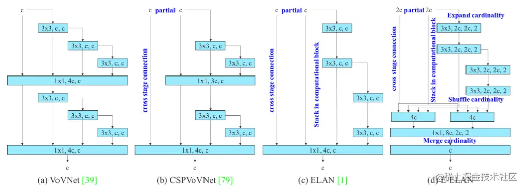 在大多数关于设计高效架构的文献中,主要考虑的无非是参数的数量、计算量和计算密度。Maet 等人还从内存访问代价的特点出发,分析了 输入/输出通道比率、架构的分支数量和 element-wise OP 对网络推理速度的影响。Dollar 等人在执行模型缩放时还考虑了激活,即更多地考虑卷积层输出张量中的元素数量。下图 b 中CSPVoVNet 的设计是 VoVNet 的变体。CSPVoVNet 的架构除了考虑上述的基本设计问题外,还对梯度路径进行了分析,使不同层的权重能够学习到更加多样化的特征。下图 c 中的 ELAN 考虑了:如何设计一个高效的网络。答案是:通过控制最短最长梯度路径,深度网络可以有效学习和收敛。在论文中,作者提出了基于 ELAN 的 Extended-ELAN (E-ELAN),其主要架构如下图 d。