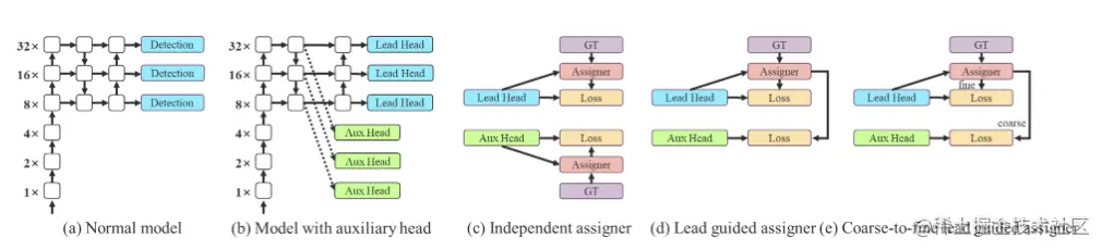 无论 auxiliary head 或 lead head 的情况如何,都需要对最终目标进行深度监督训练。作者在开发软标签分配器相关技术的过程中,偶然发现了一个新的衍生问题,即:如何分配软标签给 auxiliary head 和 lead head。相关文献还没有探讨过这个问题。如下图c,目前最流行的方法是将 auxiliary head 和 lead head 分开,利用各自的预测结果和 ground truth 进行标签分配。本文提出的方法是一种通过 lead head 预测来同时引导 auxiliary head 和 lead head 标签分配的方法。换句话说,就是以 lead head 预测为指导,生成从粗到细 coarse-to-fine 的层次标签,分别用于 auxiliary head 和 lead head 学习。提出的两种深度监督标签分配策略分别如下图d 和 e。