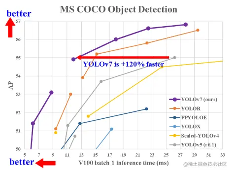 YOLOv7 与 state-of-the-arts 检测器进行比较: