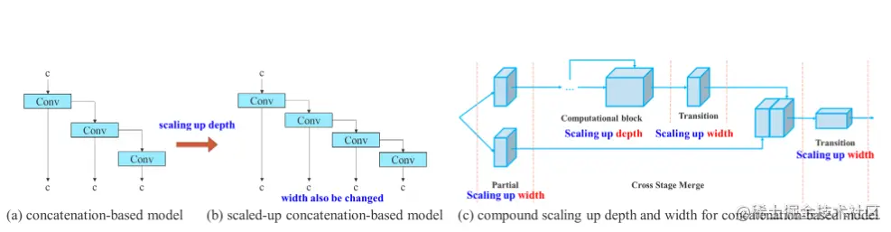 以上方法主要应用于 PlainNet 或 ResNet。当这些架构在执行放大或缩小时,每一层的入度和出度不会发生变化,因此我们可以独立分析每个缩放因子对参数量和计算量的影响。然而,如果将这些方法应用于基于级联的架构时,作者发现当对深度进行放大或缩小时,计算块之后的转换层的入度将会减少或增加,如下图 a 和 b。