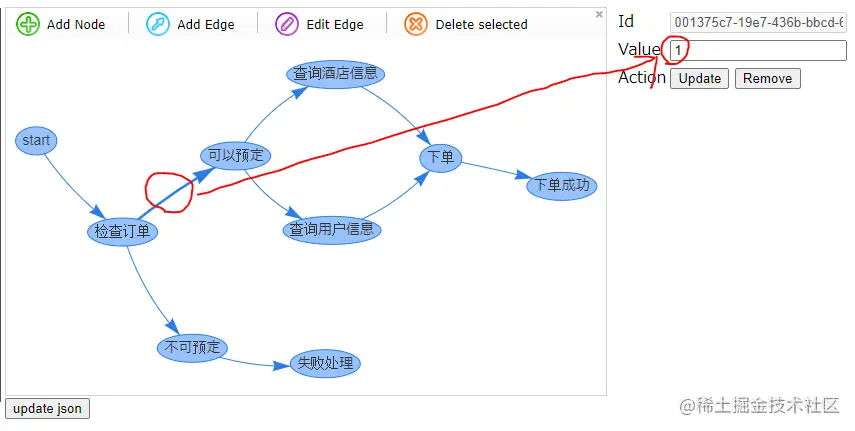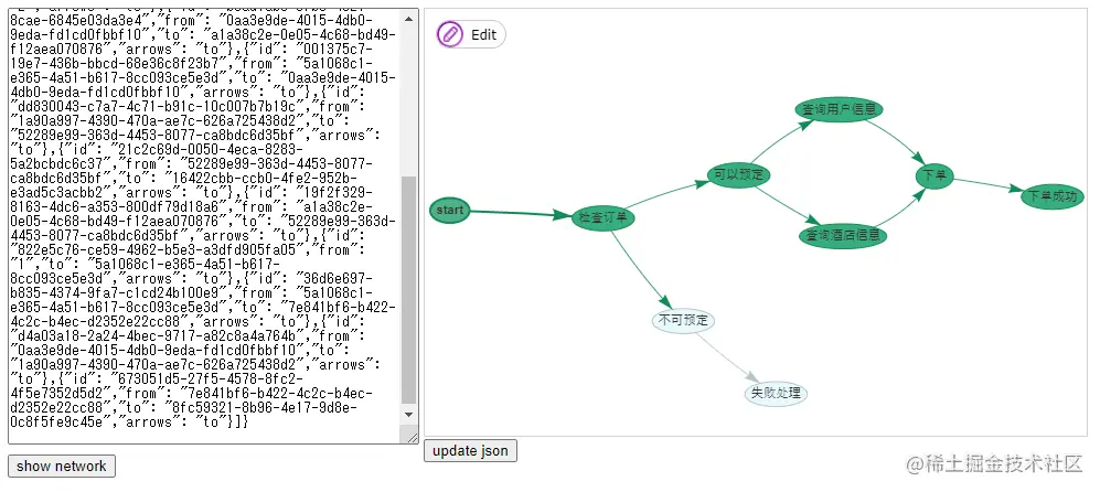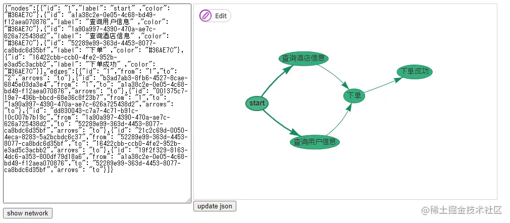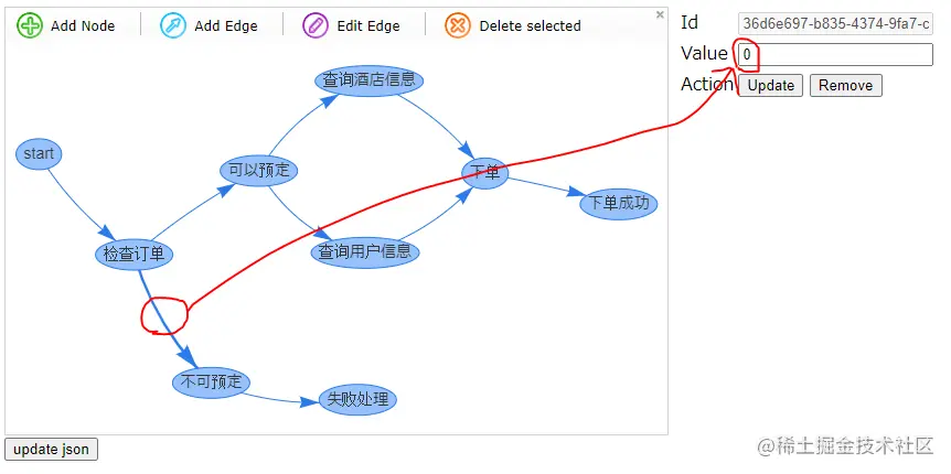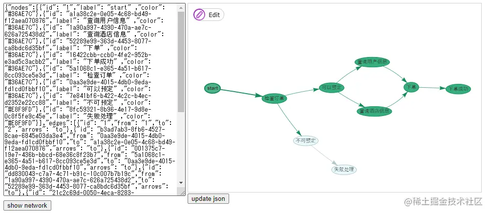 画完流程图后,点击[update json]按钮,可以生成流程图对应的json文件。
