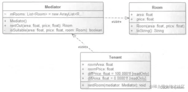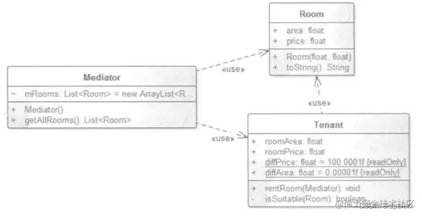 上面的代码中,Tenant 不仅依赖 Mediator 类 ,还和 Room 类进行频繁的交互,租客类要求是通过中介找到一间合适自己的房间,如果把这些检测条件都放在了 Tenant 类中,则会削弱中介的功能,而且导致 Tenant 类和 Room 类的耦合性较高。上面的代码结构如下图所示。
