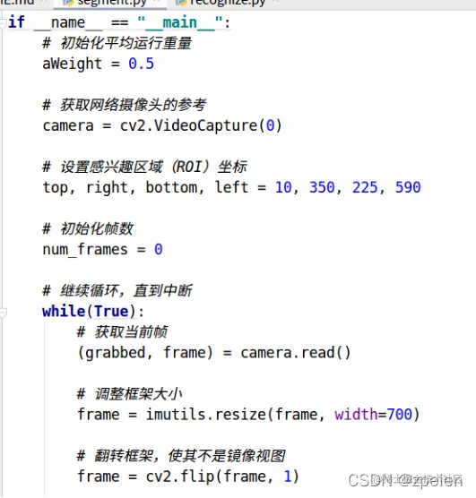 上面的代码示例是我们程序的主要功能。我们将aWeight初始化为0.5。如移动平均值方程式中更早显示的那样,此阈值意味着如果为该变量设置较低的值,则将在较大数量的先前帧上执行移动平均值,反之亦然。我们使用cv2.VideoCapture(0)引用了我们的网络摄像头,这意味着我们在计算机中获取了默认的网络摄像头实例。