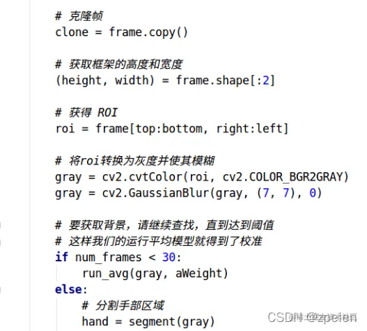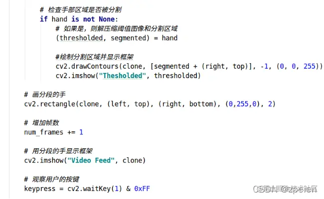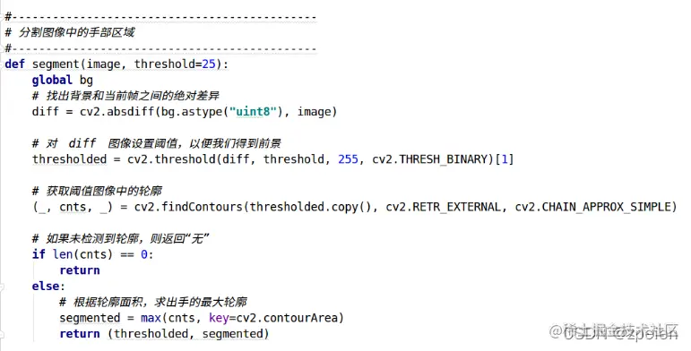 下一个功能用于从视频序列中分割手部区域。这个函数有两个参数- 当前帧和阈值用于阈值化的差分图像。