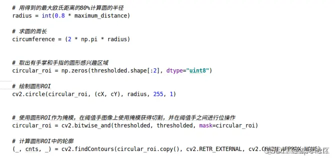 - 使用手掌的中心,以最大欧几里德距离(手掌的中心与端点之间)为半径,构造一个圆。