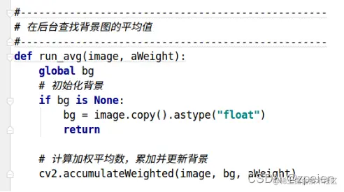 我们使用函数来计算背景模型和当前帧之间的移动平均值。此函数接受两个参数- iamge(当前帧)和aWeight,这就像在图像上执行移动平均的阈值。如果背景模型为“ 无”(即,如果它是第一帧),则使用当前帧对其进行初始化。然后,使用cv2.accumulateWeighted()函数计算背景模型和当前帧的移动平均值。使用下面给出的公式计算移动平均值